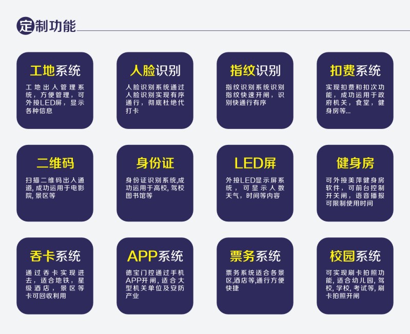 系統(tǒng)解決方案包括:大廈一卡通、小區(qū)一卡通、企業(yè)一卡通、校園一卡通等。通過覆蓋全省的銷售和服務網絡,“HR”品牌的產品和系統(tǒng)以其_的功能、_的性價比和可靠性,已經廣泛地應用于政府、稅務機關、銀行、郵電、大型廠礦、部隊、智能小區(qū)及交通等各個領域,倍受各界用戶的青睞,使客戶盡情享受智能科技帶來的高品質生活。 市場給了我們機遇,客戶給了我們發(fā)展,競爭給了我們動力。